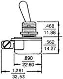 Carling Technologies Toggle Switch (spst) 2 Conn., on/off. Model: 110-S-73. More details: Toggle Switch, Contact Form Spst, Number Of Connections 2, Switch Function On/off, Terminals Screw, Mounting Hole 0.5 In. Dia., Ac Contact Rating 6a @ 125v, 3a @ 250vactuator Style Bat, Actuator Length 0.687 In., Stem Length 0.465 In., Stem Dia. And Thread Size 0.5 In., Operating Temp. Range 0 Degrees To 150 Degrees F, Actuator Color Silver, Stem Color Silver