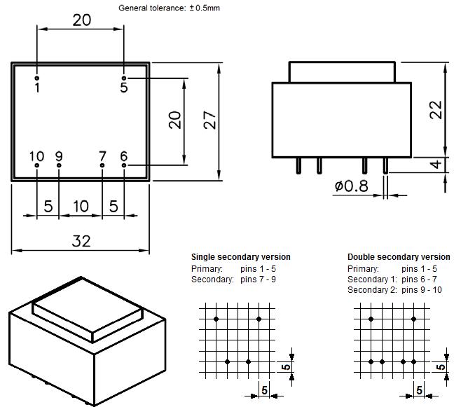 Трансформатор для монтажа на печатную плату. Герметизация эпоксидной смолой; электрическая прочность изоляции 5000 В. Соответствует европейскому стандарту качества EN61558. Применяется в устройствах, выполненных с использованием печатных плат: в компьютерах и их периферии, промышленных контроллерах, телекоммуникационных приборах, медицинском оборудовании, в схемах питания ламп освещения, измерительной технике, бытовых приборах. Предусмотрена защита от короткого замыкания.