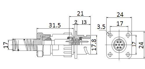 Цилиндрический соединитель серии FQ14. Блочное исполнение передней части корпуса, и патрубок для кабеля с металлическим амортизатором. Максимальный диаметр устанавливаемого кабеля 7 мм. Количество установленных контактов 7, контакты штыревые, под пайку провода. Разъёмы соединяются байонетным сочленением. Использование высококачественных материалов обеспечивает низкое сопротивление контактов, высокую виброустойчивость, ударостойкость, влагозащищенность и хорошую изоляцию этих соединителей. Применяются в электрических сетях постоянного и переменного тока.