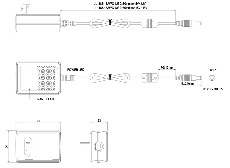 AC-DC источник питания, настенный. Номинальная мощность 18 Вт. Универсальный вход 90-264VAC. II класс мощности. Светодиодный индикатор питания. Комплекс защит: от перегрузки, от перенапряжения, от короткого замыкания.