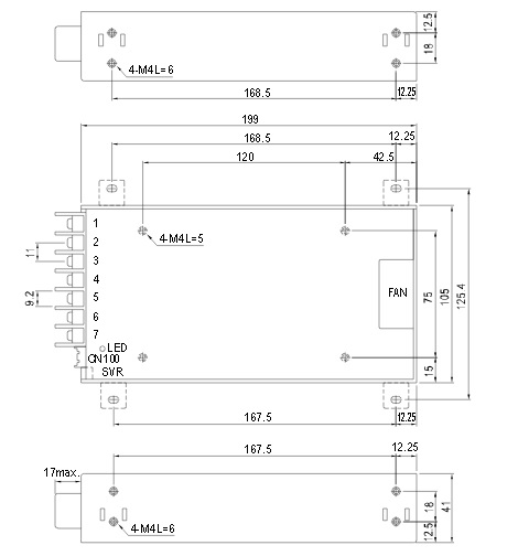 Высокоэффективный ипульсный низкопрофильный AC-DC источник питания, номинальная мощность 300 Вт. Обладает коррекцией коэффициента мощности PFC. Универсальный вход 85-264VAC. Дополнительный выход 5В/0.3А, дистанционное включение/выключение, ограничение тока, сигнал DC OK, компенсация на проводах. Выдерживает 300VAC входного перенапряжения в течение 5 секунд. Комплекс защит: от перегрузки, от перенапряжения, от короткого замыкания, от перегрева.