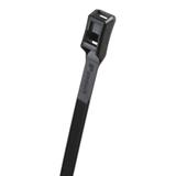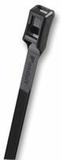Hyper-V Cable Tie, In-Line, 20.7 Inches (525 mm) Length, Weather Resistant, Black. Fixed and flexible two-wedge locking design provides a low threading force. Teeth on both sides of cable tie body provide additional locking strength and improved flexibility to conform to irregular bundle shapes such as securing cables to cable tray systems. Releasable head position for temporary bundling of cables prior to final locking. No need to replace ties when adding cables/wires to the bundle. Teeth on full length of body support a wide range of bundle diameters. Bending serrations on the tip of the tie allows the tip to be easily formed into an arc. enabling installer to fish the tie around the bundle in a confined space. Threading hole in the tip of the tie allows an installer to hook the tip with a simple device to pull the tie through spaces with limited access. In-Line tie design for parallel-entry of the tie into head resulting in a lower profile on cable bundles.
