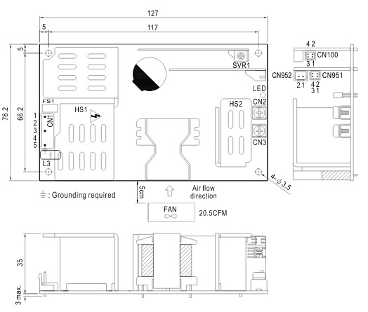 Высокоэффективный импульсный AC-DC источник питания. Номинальная мощность 300 Вт. Универсальный вход 90-264VAC. Встроенная активная PFC функция, компенсация на проводах. Малый ток утечки на землю. Выдерживает 300VAC входного перенапряжения в течение 5 секунд. Отдельный выход на вентилятор 12В/0.5А. Комплекс защит: от перегрузки, от перенапряжения, от короткого замыкания, от температуры. Применяется в медицинском оборудовании.