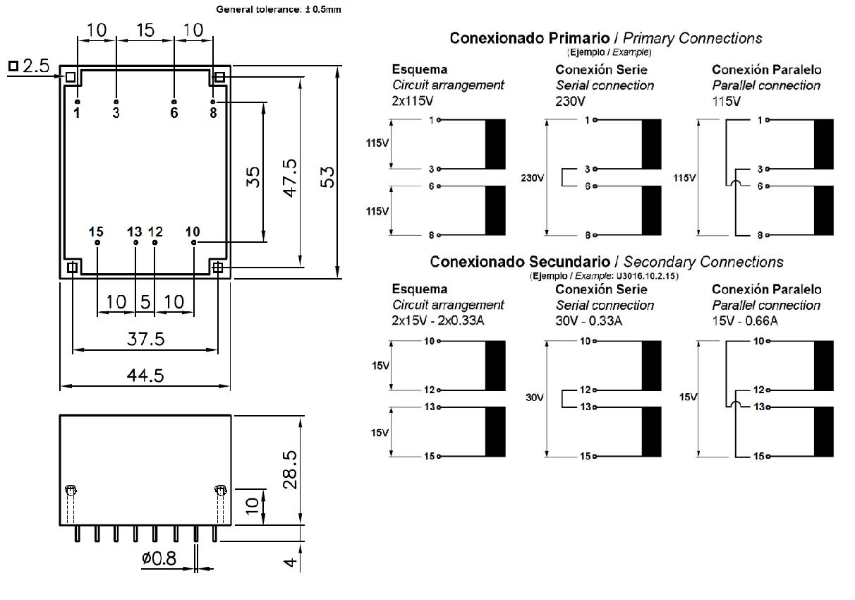 Низкопрофильный трансформатор для монтажа на печатную плату. Герметизация эпоксидной смолой; электрическая прочность изоляции 5000 В. Соответствует европейскому стандарту качества EN61558. Применяется в устройствах, выполненных с использованием печатных плат: в компьютерах и их периферии, промышленных контроллерах, телекоммуникационных приборах, медицинском оборудовании, в схемах питания ламп освещения, измерительной технике, бытовых приборах.